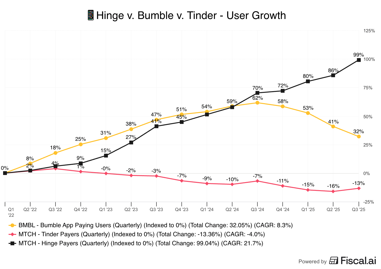 Today, Hinge is the only app of the big 3 that has seen positive paying user growth over the last 4 quarters.