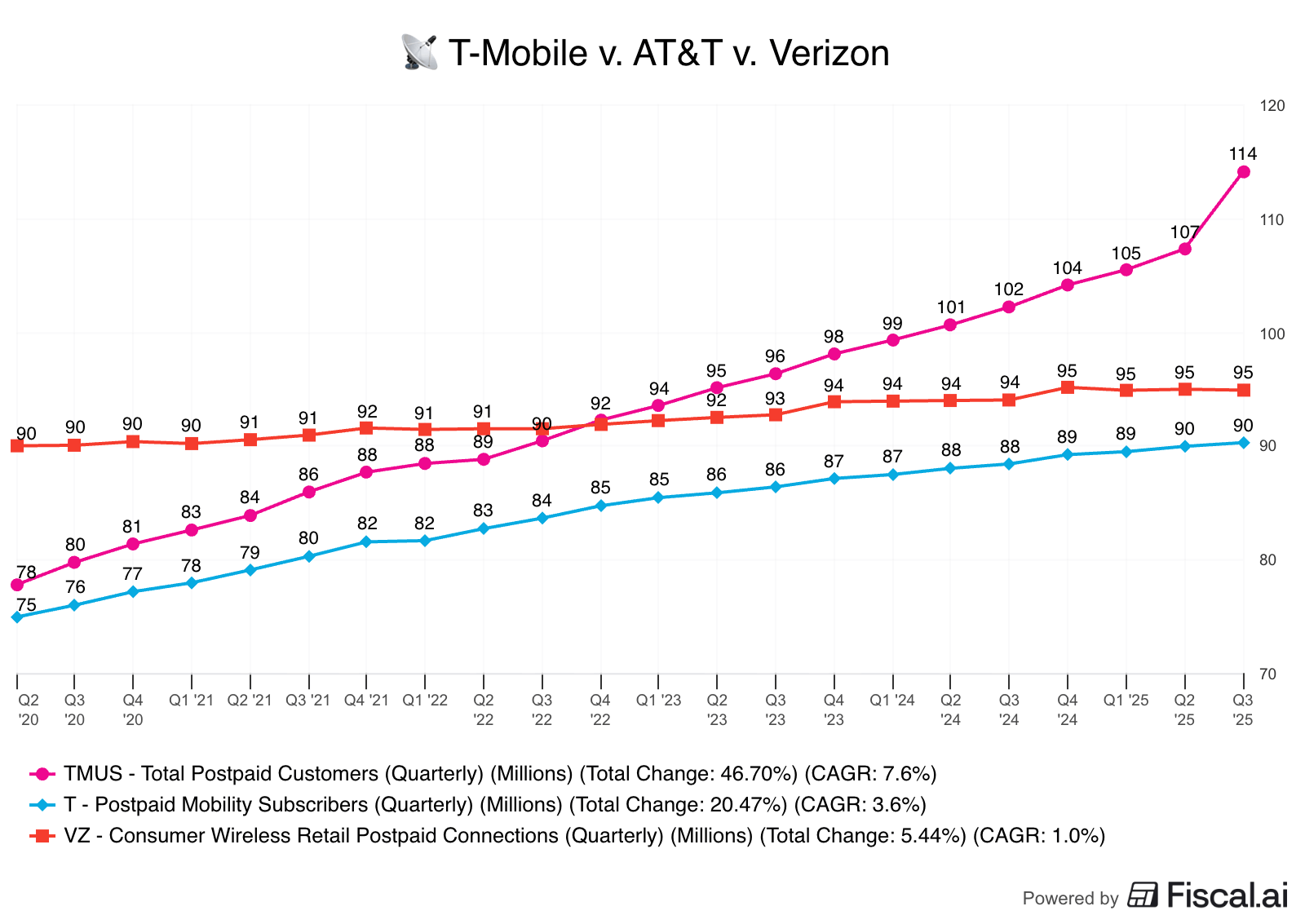 Over the last 5 years, T-Mobile has added 36 million new postpaid subscribers, compared to AT&T’s 15 million and Verizon’s 5 million.