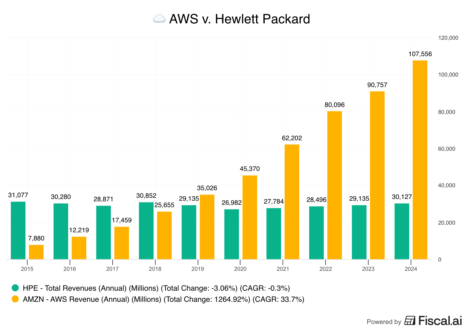 10 years ago, Hewlett Packard Enterprise was generating 4x more revenue than AWS. Today, it’s almost exactly flipped as AWS earns 3.7x more revenue.