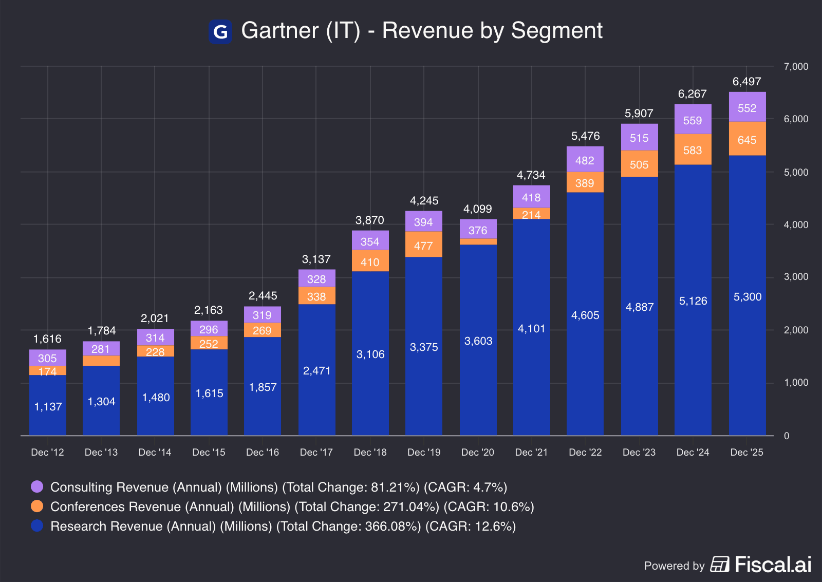 While Gartner has a consulting arm, the bulk of their revenue actually comes from selling their research to the IT industry.